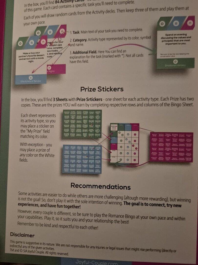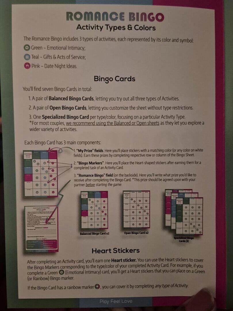 The cards were a bit flimsy however, for us they held up just perfect. This is a neat twist on bingo that makes the romance last. This isn't just a date night. This makes the daily romance fun and motivated.
